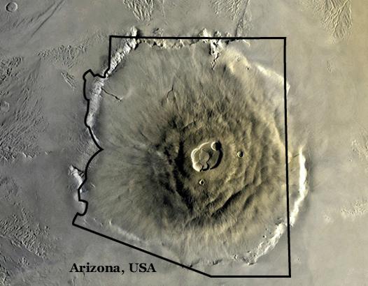 El monte Olimpo, que se encuentra en el hemisferio occidental de Marte, es tres veces más alto que el monte Everest y tiene aproximadamente el tamaño de Arizona, mientras que los valles de Mariner, a menudo llamados 'el Gran Cañón de Marte', abarca aproximadamente el ancho de los Estados Unidos.